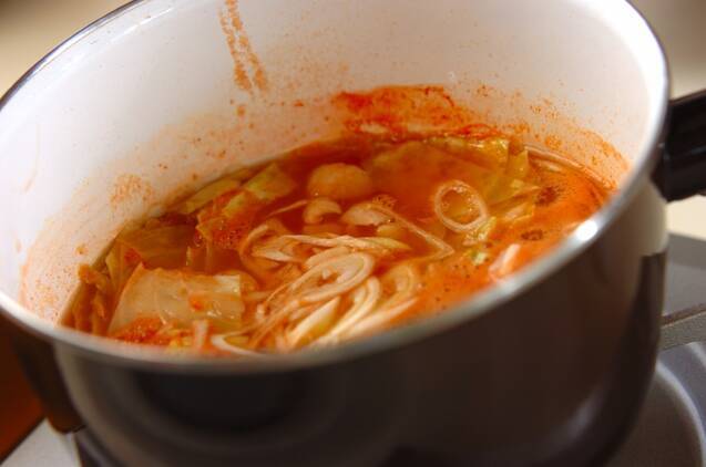鍋に鶏もも肉、キャベツ、白ネギ、ニンニク、<スープ>の材料を入れて火にかける。