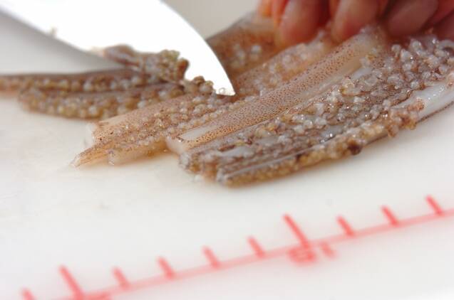 足は目の際で切り落としてくちばしを取り、足先を切り揃える。吸盤は包丁でこそげ落とし、2本ずつに切り分ける。