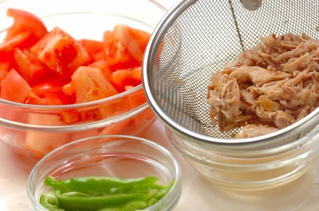 ピーマンは縦半分に切り、ヘタを取って縦細切りにする。トマトは横半分に切ってヘタと種を取り、2cm角に切る。ツナはザルに上げ、油をきる。