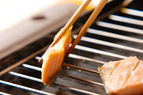 グリルの網に薄くサラダ油を塗り鮭の皮側から焼けるように並べ、弱火にして3~4分焼き、皮に焼き色がつけば、鮭を返して、焼き色がつくまで焼いて取り出し冷ましておく。