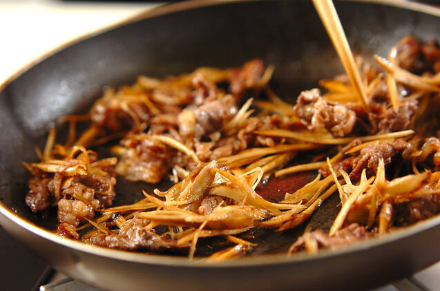 フライパンにサラダ油を強火で熱し、牛肉、ゴボウ、ショウガを炒め合わせ、<調味料>の材料を加える。煮たったら中火にし、煮汁が少なくなるまで炒める。