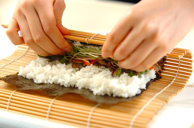 指で具を押さえながら、巻きすごと持ち上げ、手前のすし飯と向こう側のすし飯の端どうしを合わせ巻く。巻き終わりを下にして巻きすの上から両手で押さえ、形を整える。同様にもう1本巻き、食べやすい幅に切って器に盛る。