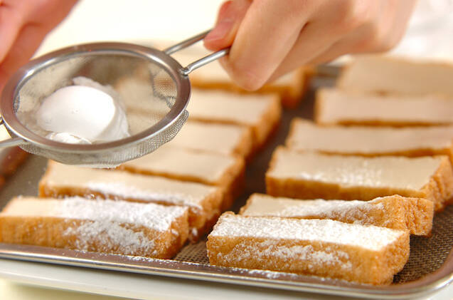 厚揚げは熱湯をかけて表面の油を落とし、水気を拭き取る。縦5等分に切り、片栗粉をまぶす。