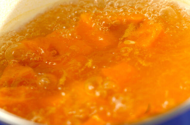 鍋にカボチャを入れてヒタヒタの水を加え、顆粒チキンスープの素を入れて火にかける。カボチャが柔らかくなるまで中火で8~10分位煮る。