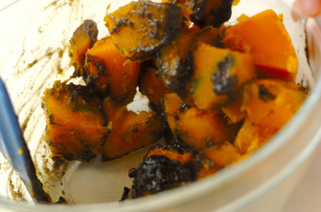 カボチャの汁気をきり、<和えダレ>のボウルに入れて和え、器に盛る。