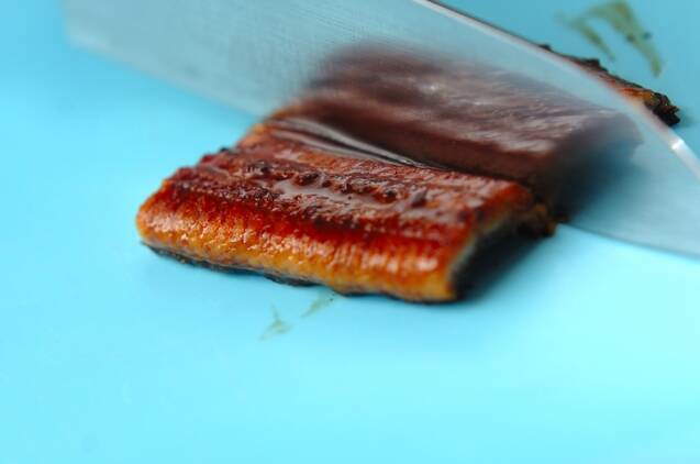 ウナギ蒲焼きは幅を2等分に切り、卵焼き器の長さに合わせて切る。
