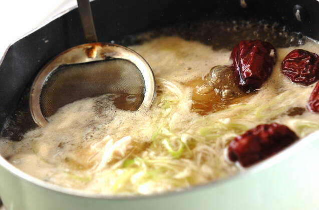 鍋に<スープ>の材料を入れて強火にかけ、煮たったら<具>の材料を加えて、アクをとりながら中火で15分煮る。