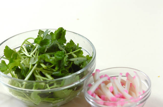ミツバは根元を切り落とし、長さ4cmに切る。