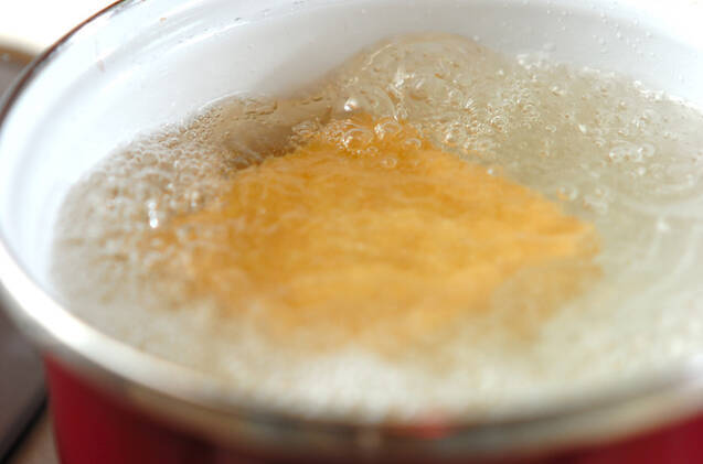 厚揚げは熱湯で2分ゆで、ザルに上げて水気をきる。キッチンペーパーで水気を取り、縦に半分に切ってさらに幅1cmに切る。