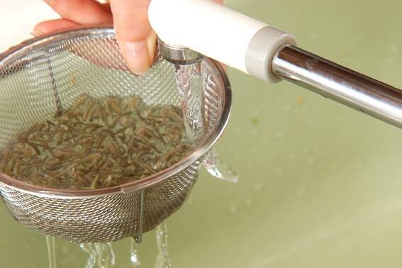 じゅんさいはザルにあけて水気を切り、サッと水洗いする。