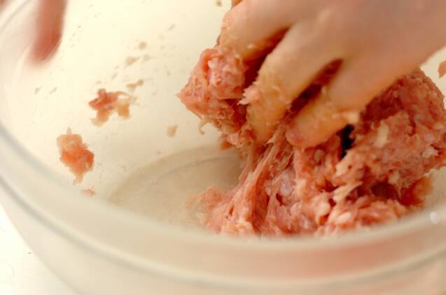 ボウルに鶏ひき肉、塩を入れ、粘りがでるまでしっかり手で練る。