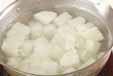 大根は皮をむいて2cm幅の輪切りにし、4つに切り面取りをして鍋に入れ、お米のとぎ汁を加え10分位ゆで半透明になればザルに上げる。お米のとぎ汁がない場合は、水に小さじ1のお米を加えてゆでる。