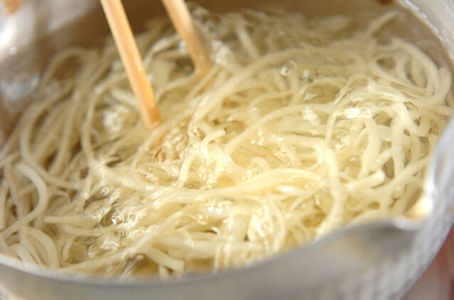 冷凍のうどん玉は熱湯でサッとゆでてほぐし、しっかり水気をきっておく。