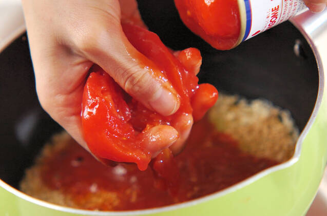 <トマトソース>を作る。鍋にオリーブ油、みじん切りにしたニンニクを入れて強火にかけ、香りが立ってきたらローリエ、砂糖、顆粒スープの素、水煮トマト(ホールの場合は手でつぶしながら加える)を加える。少しトロミがつく位まで、時々木ベラで混ぜながら10分煮込み、火を止める。