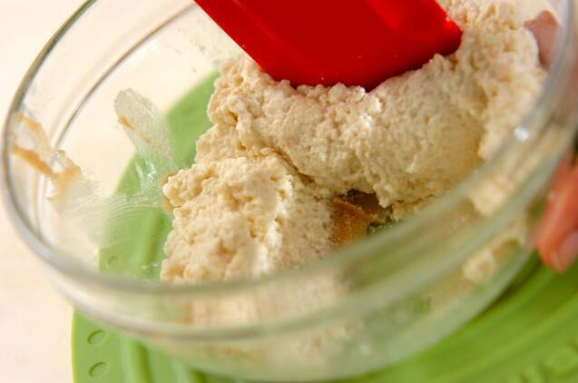 <和え衣>の絹ごし豆腐は網に通してボウルに入れ、他の材料を加えて混ぜる。