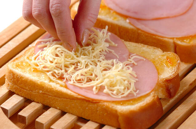 食パンに1のバター、お好みのジャムを順に塗り、ハムを2枚ずつのせてピザ用チーズを散らす。