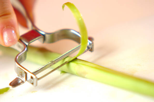 グリーンアスパラは根元の固い部分とハカマを切り落とし、サッと塩ゆでしてザルに上げ、水気をきる。