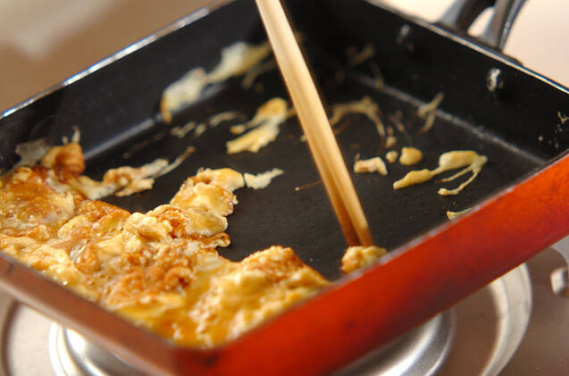 卵焼き器を中火で熱し、サラダ油を薄くひく。<卵液>の1/4量を流し入れ、菜ばしで向こう側に寄せる。
