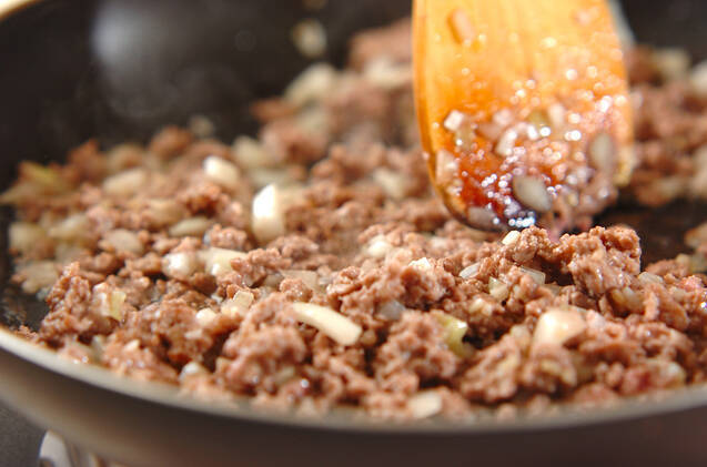 フライパンにサラダ油を熱し、玉ネギ、ニンニク、ショウガを炒め、しんなりしたら合いびき肉を加え、色が変わるまで炒める。