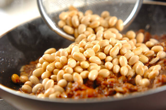 カレー粉を加えて香りがたったら、<調味料>の材料と水煮大豆を加え、汁気を飛ばすように炒め、塩コショウで味を調える。