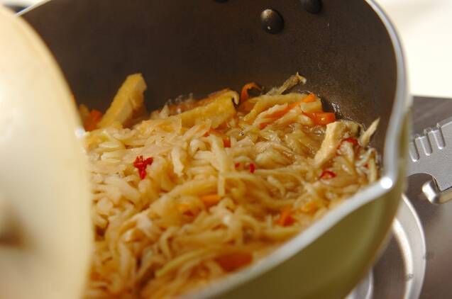 煮たってきたら<調味料>の材料を加え、再び煮たったら火を弱め、落とし蓋をして10分位煮含める。火を止めてそのまま冷まし、器に盛る。