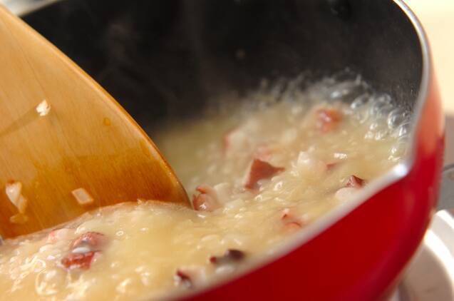 <スープ>を100mlずつ2回に分けて加え、水気を飛ばしながら強火で炒める。