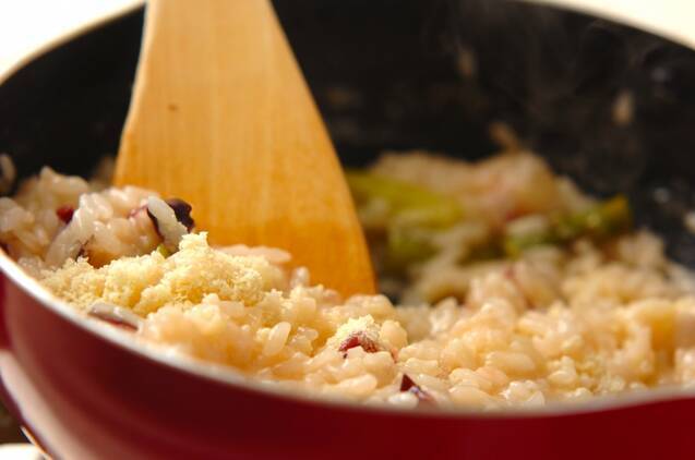 粉チーズ、残りのバターを加えて全体に混ぜ、味をみて塩コショウで味を調え、器に盛る。