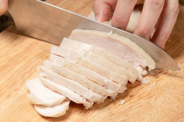 <アレンジ3.塩こんぶ炒め>サラダチキンは5mm幅の薄切りにする。大根、ニンジンは5mm幅の半月切りにする。