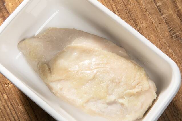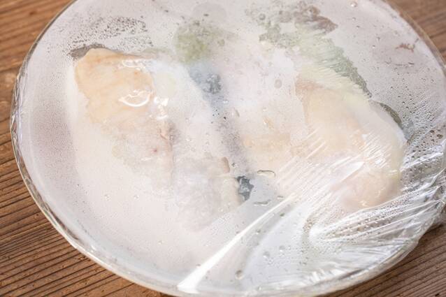 ラップをかけたまま、20分ほど置いて余熱で火を通し、粗熱をとったらサラダチキンの完成。