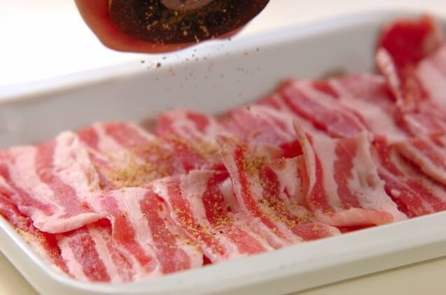 豚バラ肉は食べやすい大きさに切り、塩コショウする。