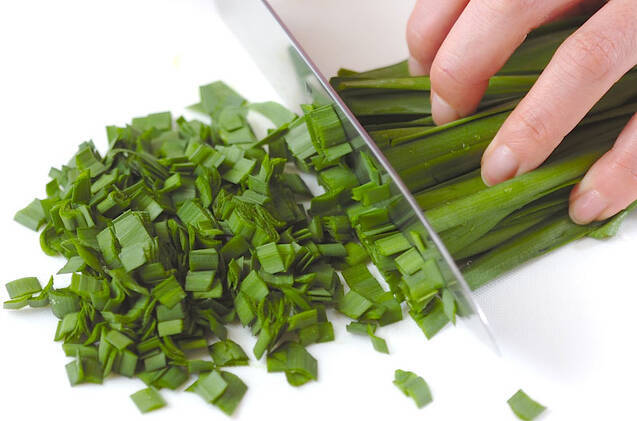 ニラは細い小口切りにして塩でもみ、水気を絞る。