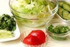 レタスは食べやすい大きさに手でちぎり冷水に放ち、パリッとすればザルに上げしっかり水気をきる。(すぐにいただかない場合は、抗菌のビニール袋等に入れて冷蔵庫に入れておいて下さい。)貝割れ菜はサッと水洗いし根元を切り落とし、長さを半分に切りレタスと合わせる。香菜はサッと水洗いし根元を切り落とし、飾り用の葉を取り置き、2cmの長さに切り、レタスと合わせる。キュウリは縦縞に皮をむき、薄い斜め切りにする。トマトは水洗いしヘタをくり抜き縦半分に切り、半月切りにする。