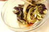 <調味料>のボウルにナス、鶏ささ身を加えて和え、器に盛る。