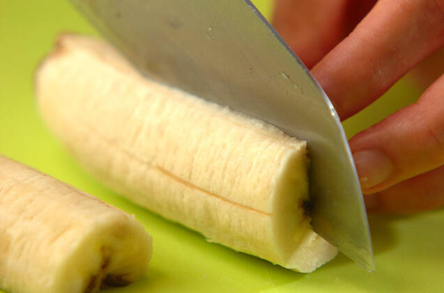 バナナは皮をむいて長さを半分に切り、さらに縦半分に切る。