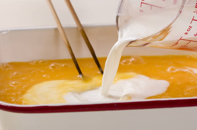 <卵液>の卵は食パンが入る大きさの容器に割り入れて溶き、他の材料と混ぜ合わせる。白桃缶は12等分のくし切りにする。天板にクッキングシートを敷き、オーブンは180℃、5分に予熱する。
