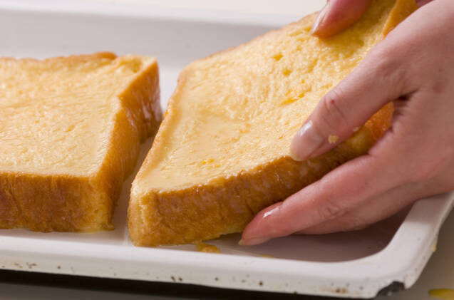 <卵液>を合わせた容器に食パンを入れて浸し、天板にのせ、180℃のオーブンで5分焼き、いったん取り出す。
