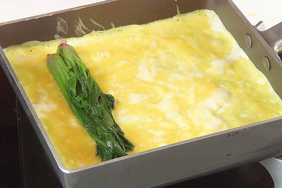 フライパン又は卵焼き器を中火にかけ、サラダ油を薄く引き、卵を流し入れて全体に広げる。