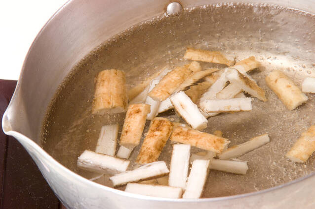 もう一度同じ熱湯に熱湯に酢少々を加え、水気を切った新ゴボウを加えてゆで、ザルに上げて水気を切る。