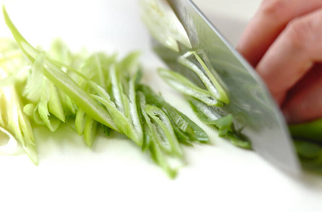 ぬれ布巾、またはキッチンペーパーでこし、<だしの調味料>の材料を加えてひと煮たちさせる。青ネギは根元を切り落としてきれいに水洗いし、斜め細切りにして水に放ち、ザルに上げる。