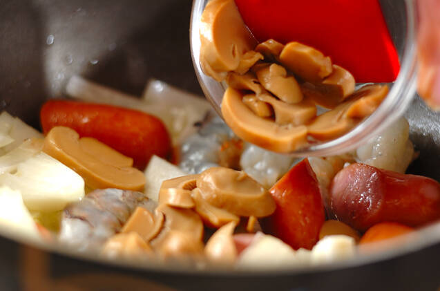 フライパンにオリーブ油、バターを入れて中火にかけ、ソーセージ、玉ネギ、エビを炒め合わせ、マッシュルームも炒め、ハーブソルト、コショウ、顆粒スープの素を加える。