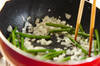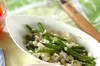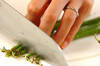 サヤインゲンは軸側を少し切り落とし、塩を入れた熱湯でゆでる。ザルに上げて水気をきり、長さを2~3等分に切る。