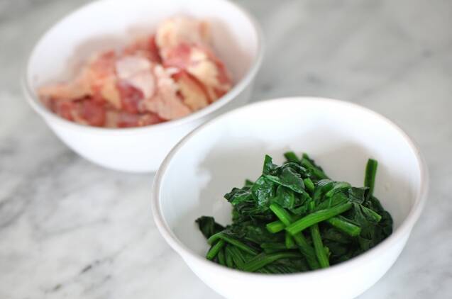 ホウレン草は3~4等分に切る。鶏肉は余分な脂を取り除き、食べやすい大きさに切り、塩、黒コショウを振る。