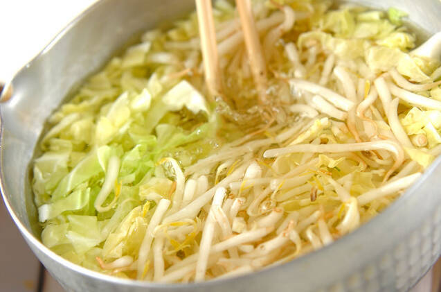 キャベツ、太モヤシは熱湯でゆでてザルに上げ、ワカメと一緒に<合わせ酢>をからめ、器に盛り分ける。