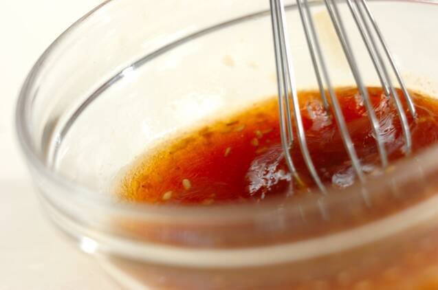 <ドレッシング>の材料をボウルに入れ、泡立て器で混ぜ合わせる。