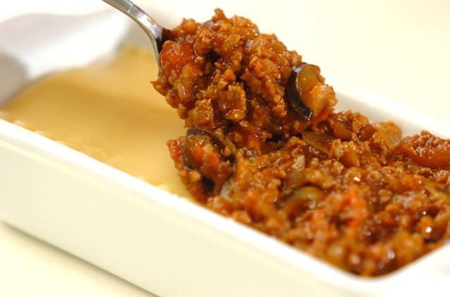 耐熱容器に分量外のバターをぬり、<ホワイトソース>の半量をしき、パスタの1/3量を並べる。その上に、<ミートソース>の半量、パスタ1/3量、残りの<ホワイトソース>、残りのパスタ、残りの<ミートソース>と重ね、竹串で全体を刺す。