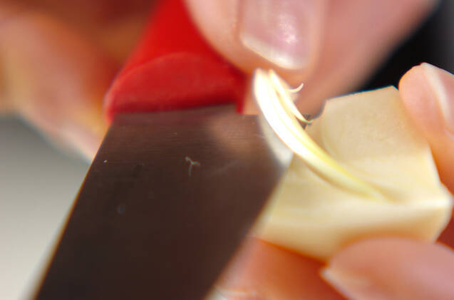 ニンニクは縦半分に切り、芽を取る。レタスは太めのせん切りにする。