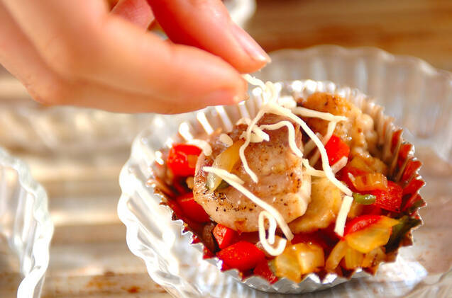 鶏もも肉に火が通ったら、アルミカップに(2)を入れ、ピザ用チーズをのせて、オーブントースターでチーズに焼き色がつくまで焼く。イチゴを添える。