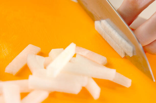 冬瓜は皮をむいて種とワタを取り出し、7~8mmの拍子切りにする。
