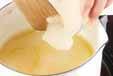 鍋にオレンジジュース、砂糖を入れて強火にかけ、砂糖が煮溶ければ火を止め、ふやかしたゼラチンを加え、余熱で木ベラで混ぜながら溶かす。