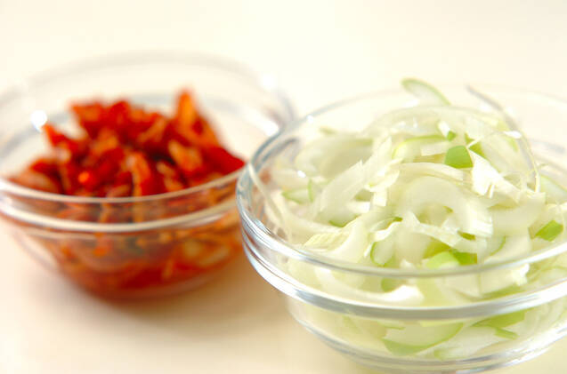 白菜キムチが大きい場合は、ザク切りに切る。白ネギは縦半分に切り、さらに斜め薄切りに切る。